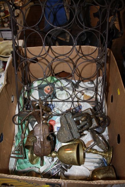 A BOX OF METALWARE TO INCLUDE WINE RACK, BRASS GOBLETS, MUSICIAN FIGURES ETC