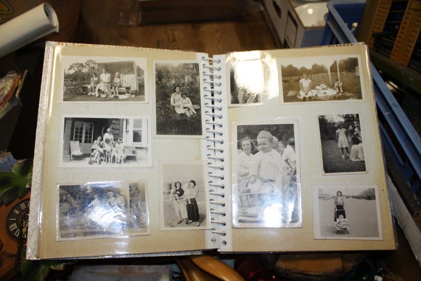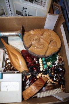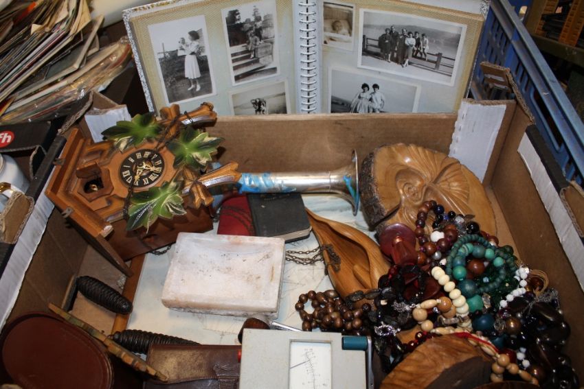A TRAY OF COLLECTABLES TO INCLUDE A CUCKOO CLOCK, BLACK AND WHITE PHOTO ALBUM, CARVED TREEN ETC