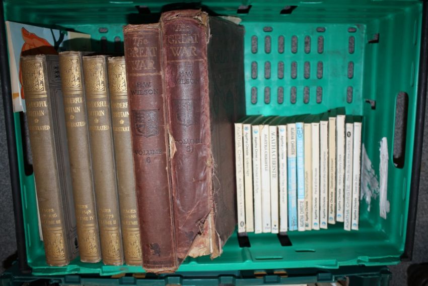 TWO BOXES OF BOOKS TO INCLUDE GREAT WAR BOOKS, AGATHA CHRISTIE BOOKS