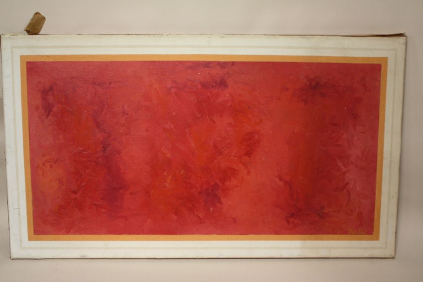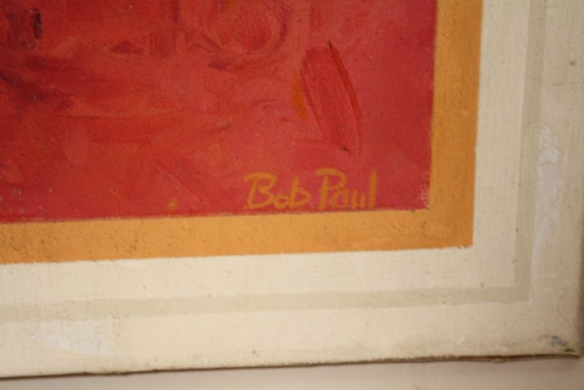 AN UNFRAMED ABSTRACT OIL ON CANVAS SIGNED BOB PAUL LOWER RIGHT - OVERALL SIZE 81CM X 46 CM