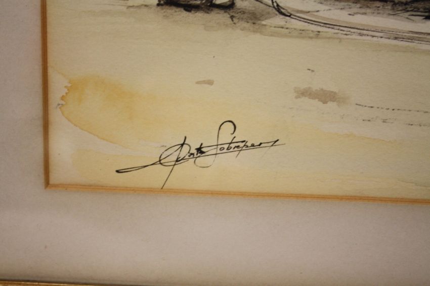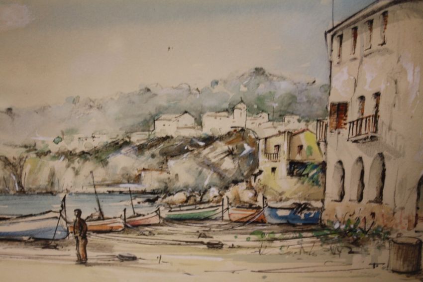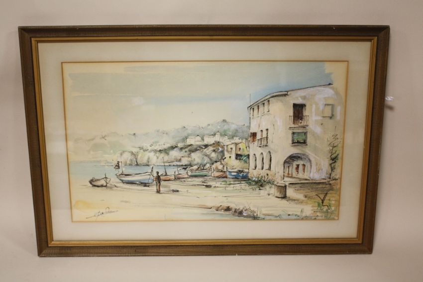 A FRAMED AND GLAZED WATERCOLOUR DEPICTING A CONTINENTAL HARBOUR SCENE INDISTINCTLY SIGNED LOWER LEFT