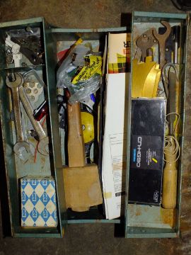 A METAL TOOLBOX PLUS CONTENTS, CASED DRILL ETC