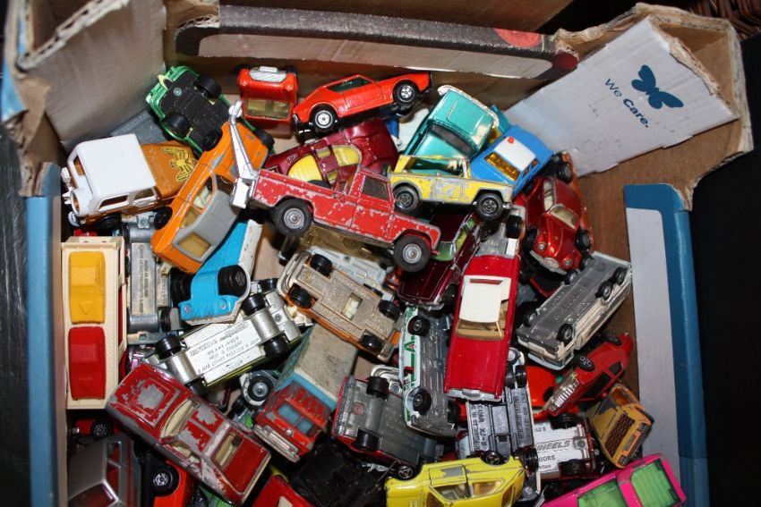 A BOX OF DIE CAST TOY CARS TO INCLUDE CORGI AND MAJORETTE EXAMPLES