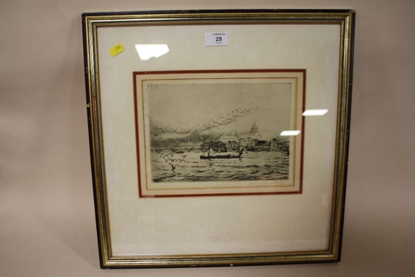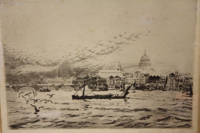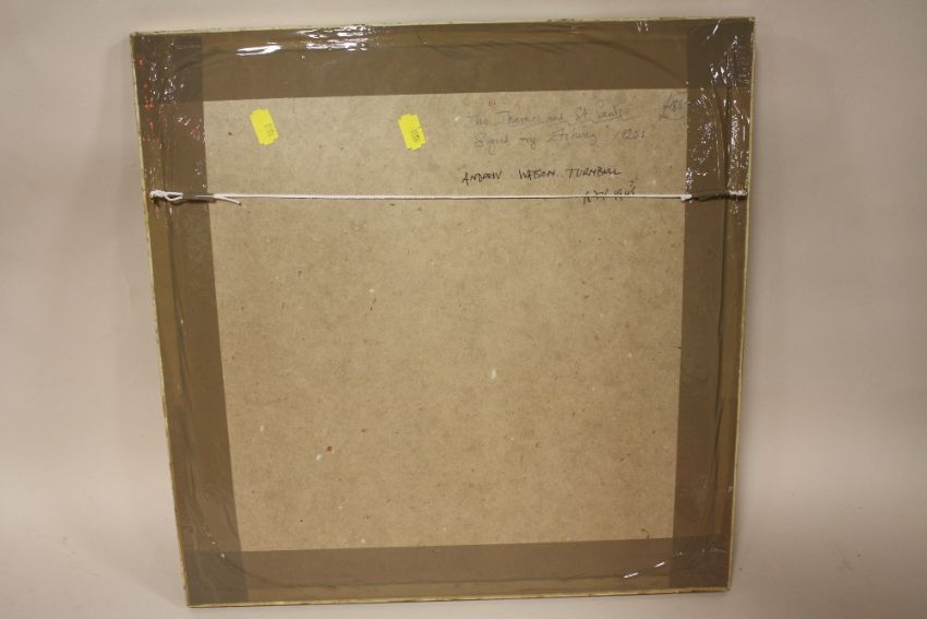 A FRAMED AND GLAZED SIGNED ETCHING ENTITLED 'THE THAMES AT ST PAUL'S' BY ANDREW WATSON TURNBULL, OVERALL SIZE INC FRAME 45CM X 45CM