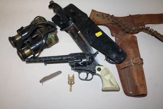 A BOX OF COLLECTABLES TO INCLUDE A RUSTLER 45 TOY GUN, BINOCULARS, KNIFE ETC.
