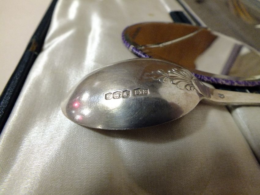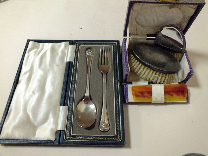 A CASED HALLMARKED SILVER HAND BRUSH TOGETHER WITH A HALLMARKED SILVER SPOON AND FORK SET
