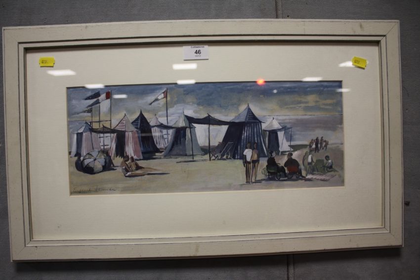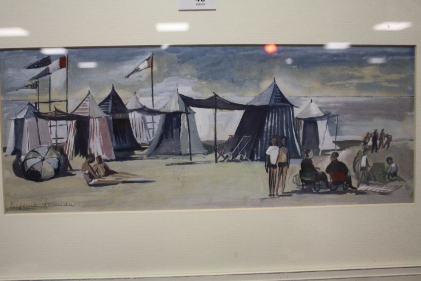A FRAMED AND GLAZED WATERCOLOUR FOR A FRENCH BEACH 'AT LE TOUQUET' BY EUGENIE FORNAU 43CM X 16.5CM