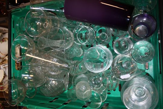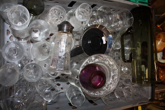 THREE TRAYS OF ASSORTED GLASSWARE TO INCLUDE A SUGAR CASTOR
