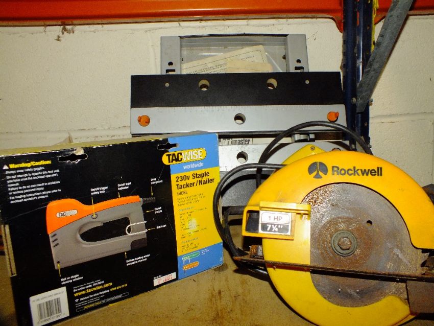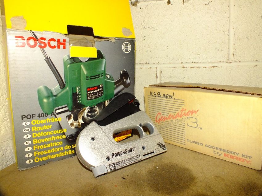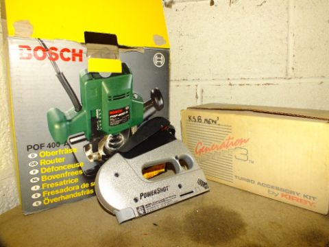 A BOSCH ROUTER, KIRBY TURBO ACCESSORY KIT, STAPLE TACKER, ROCKWELL CIRCULAR SAW, BLACK & DECKER JOBBER ETC