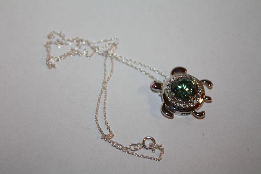 A STERLING SILVER AND BLUE MOISSANITE PENDANT ON CHAIN