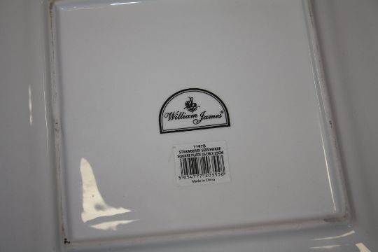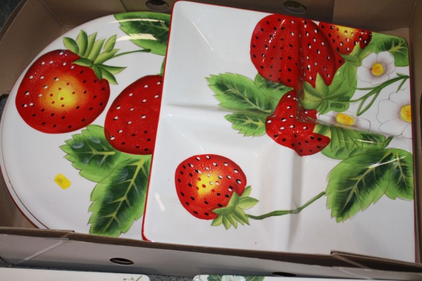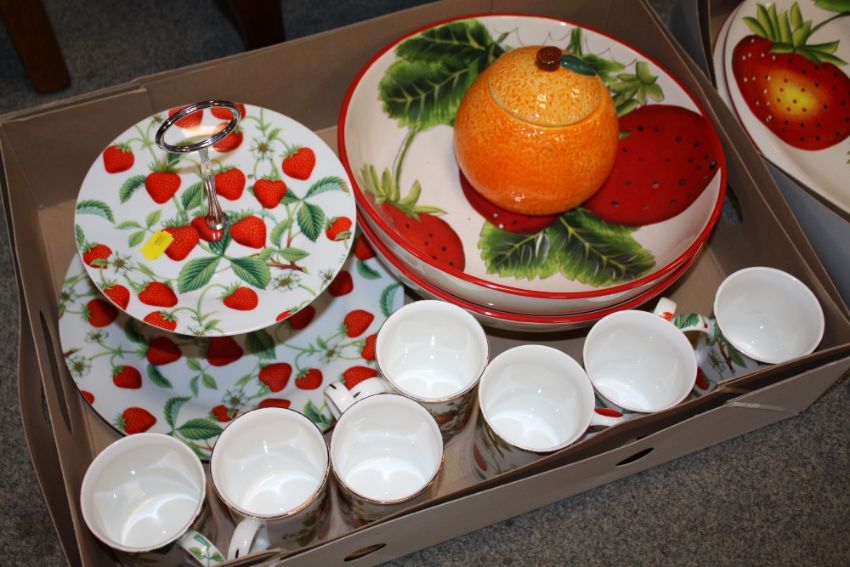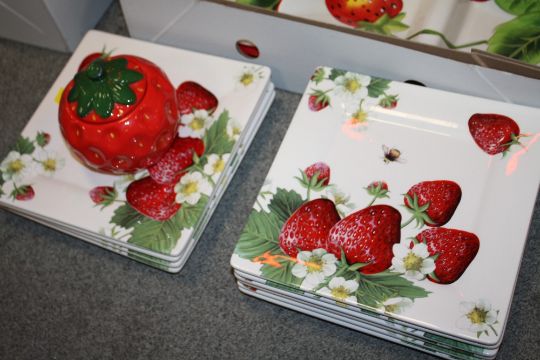 A QUANTITY OF STRAWBERRY PATTERNED DINNER WARE TO INCLUDE A CAKE STAND