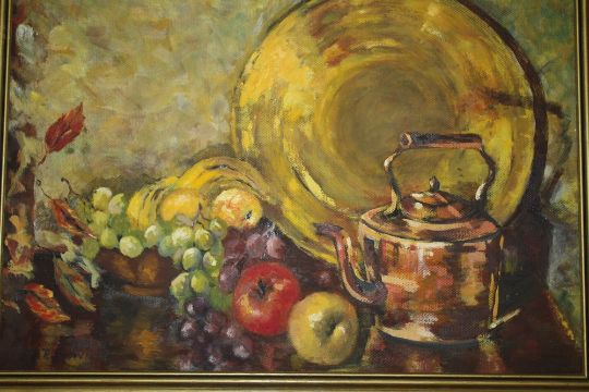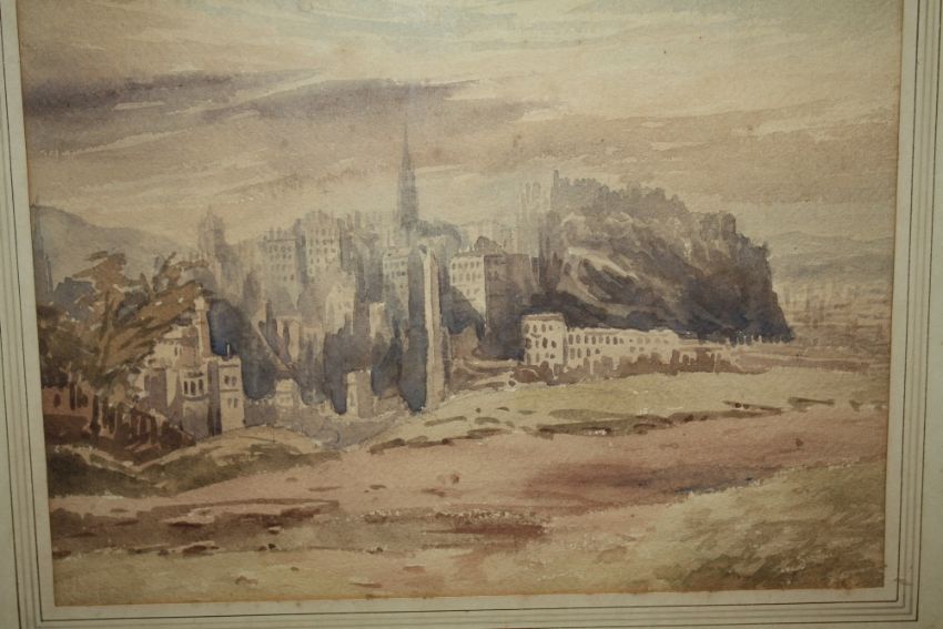 A GILT FRAMED OIL ON BOARD OF A TABLE TOPPED STILL LIFE STUDY TOGETHER WITH A WATERCOLOUR OF EDINBURGH CASTLE AND A PRINT