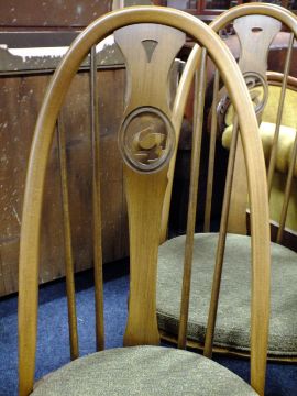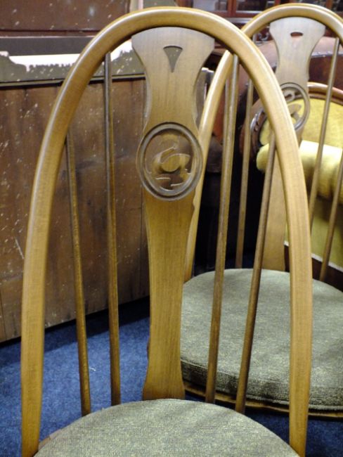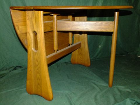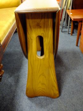 AN ERCOL WINSOR DROPLEAF TABLE WITH TWO 'SWAN' HOOPBACK CHAIRS