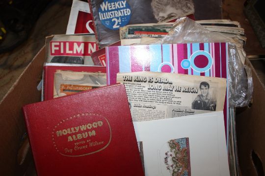 A BOX OF FILM STAR MEMORABILIA TO INCLUDE AUTOGRAPHS, POSTCARDS, MAGAZINES ETC