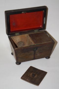 AN ANTIQUE MAHOGANY TEA CADDY OF SMALL PROPORTIONS, W 19 CM