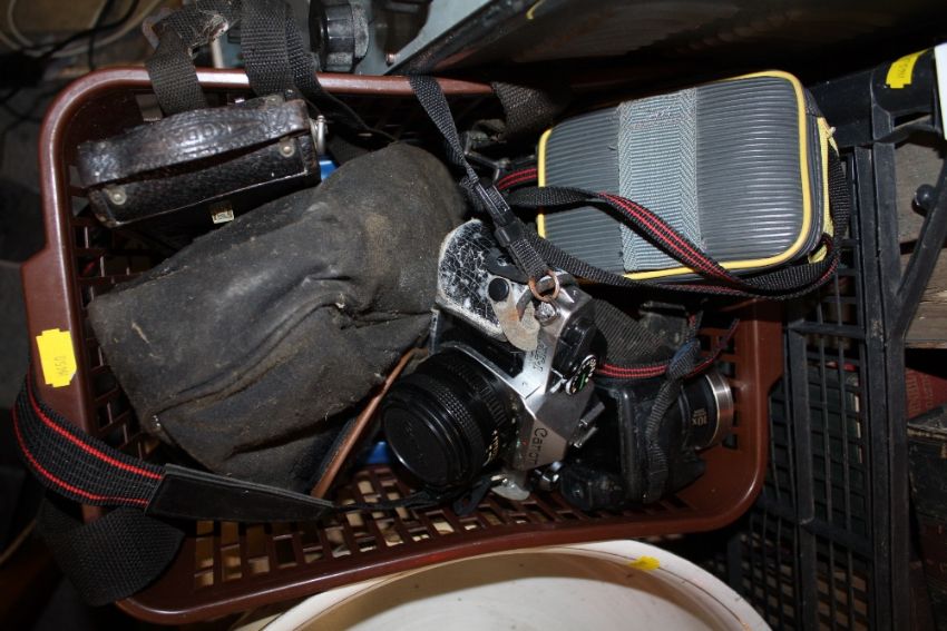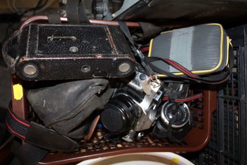 A BOX OF VINTAGE AND MODERN CAMERAS TO INCLUDE A CANON EXAMPLE