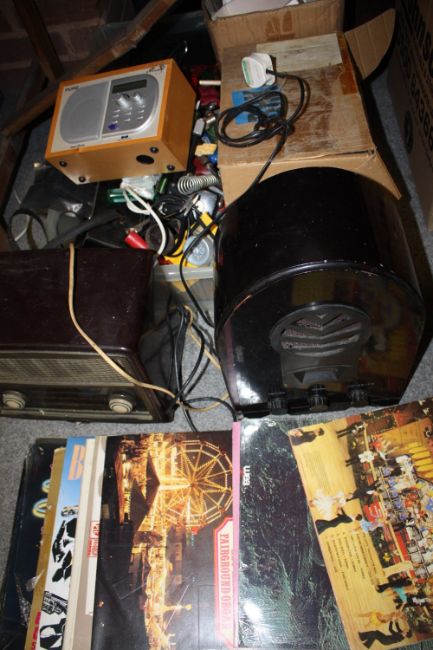 A BOX OF ASSORTED RADIOS AND ELECTRICALS TOGETHER WITH A SMALL QUANTITIES OF LP RECORDS ETC