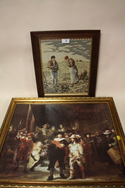 AN OAK FRAMED AND GLAZED CROSS STITCH NEEDLEWORK OF A HARVESTING SCENE TOGETHER WITH A GILT FRAMED PRINT