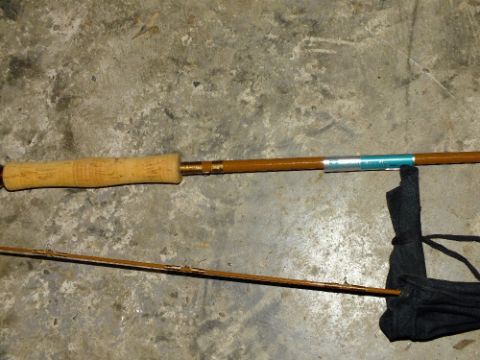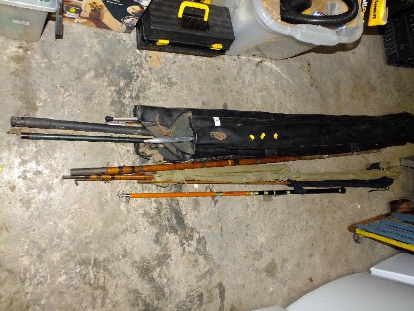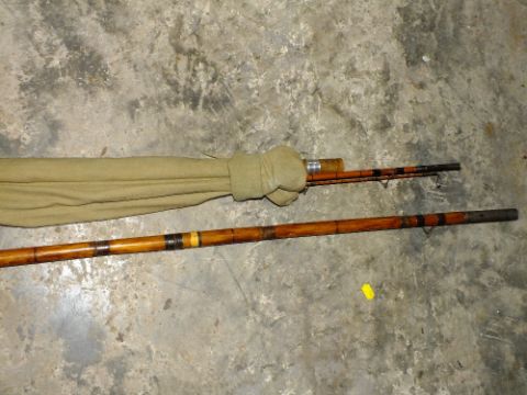 A FISHING ROD BAG PLUS CONTENTS TO INCLUDE A HEXICANE TRENTDALE ROD, SHAKESPEARE ECONOMY No 1075 ROD, WINFIELD DRYFLY ETC