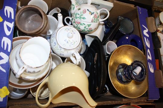TWO TRAYS OF ASSORTED CERAMICS TO INCLUDE SPICE JARS, WEDGWOOD ETC