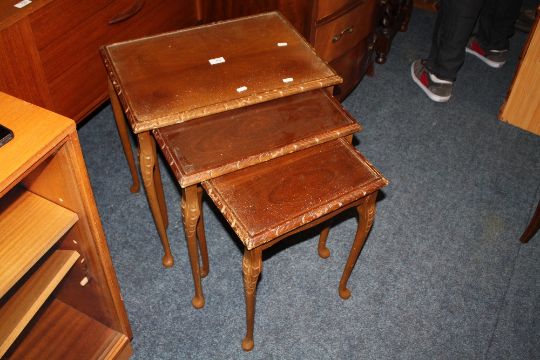 A WALNUT GLASS TOPPED NEST OF TABLES