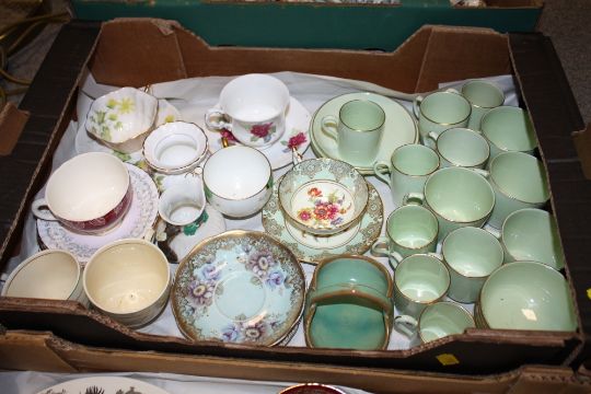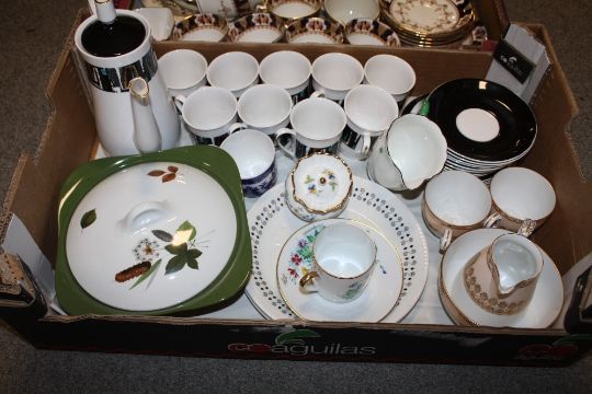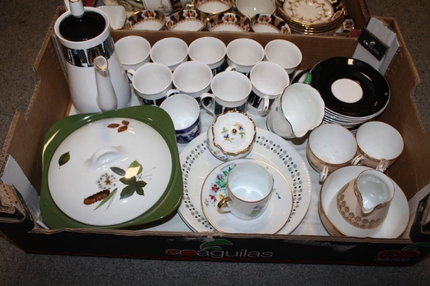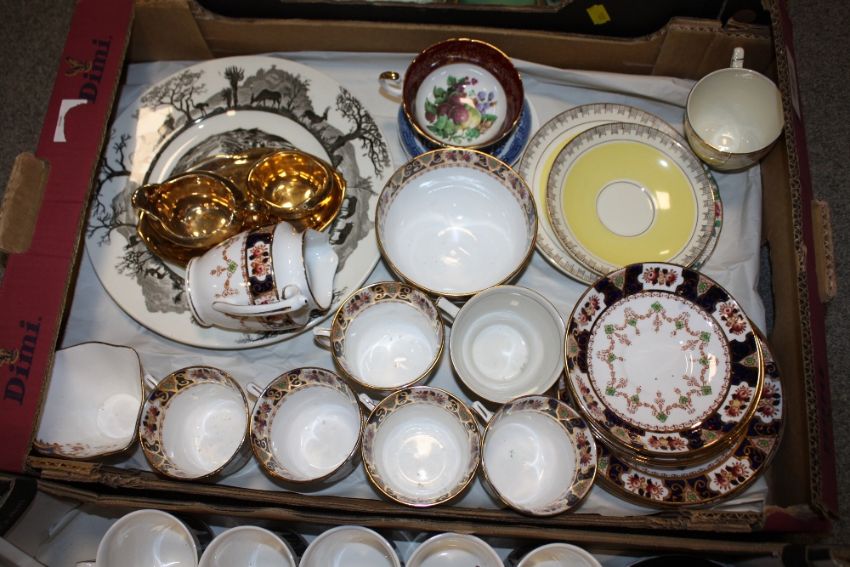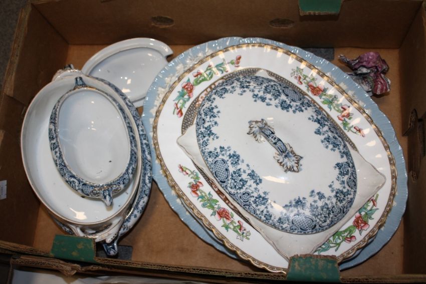FOUR TRAYS OF ASSORTED CHINA TO INCLUDE A WEDGWOOD QUEENSWARE MEAT PLATE ETC