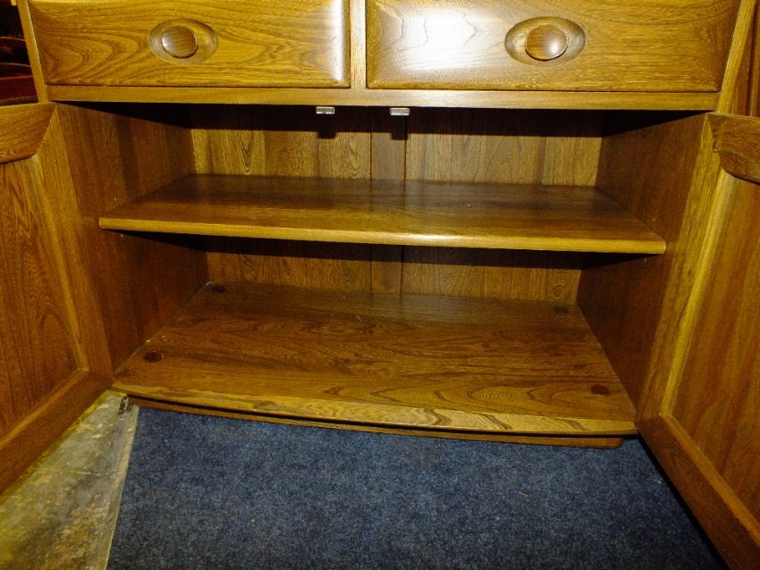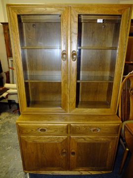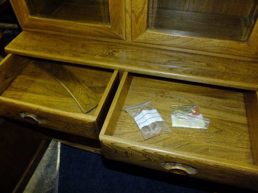 AN ERCOL WINSOR GLAZED BOOKCASE WITH TWO DRAWERS AND CUPBOARDS BELOW H-160 W-91 CM