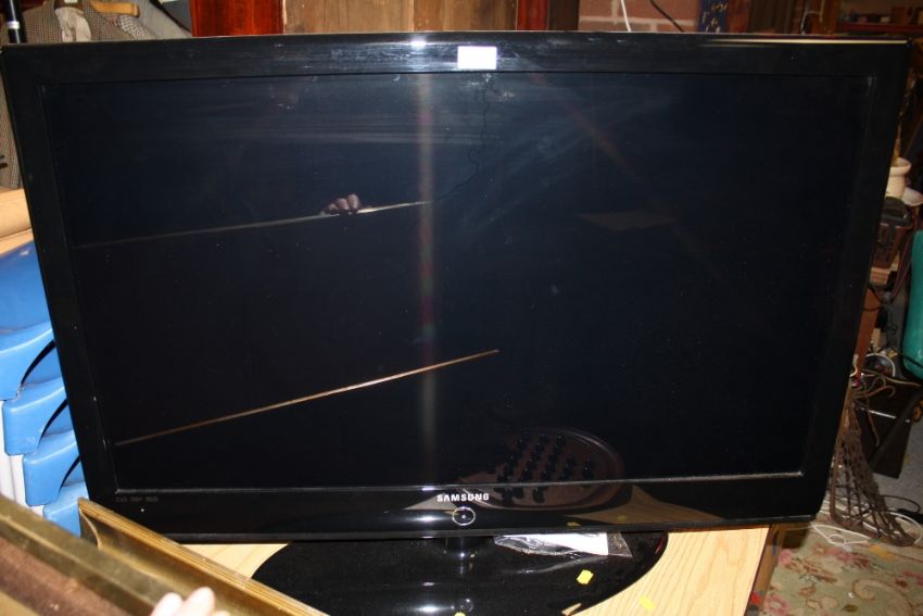 A SAMSUNG 40 INCH FLAT SCREEN TV WITH REMOTE AND INSTRUCTIONS