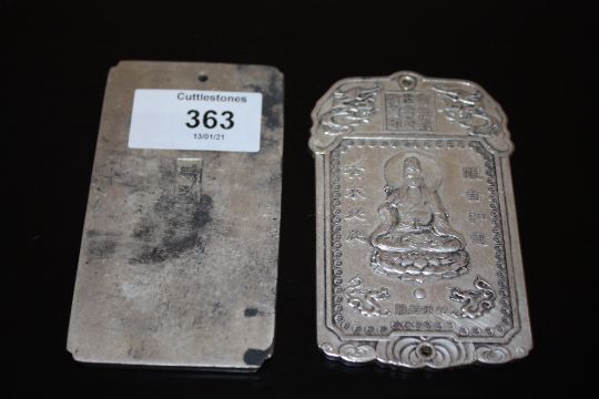 TWO ORIENTAL STYLE WHITE METAL PLAQUES/ TALISMANS