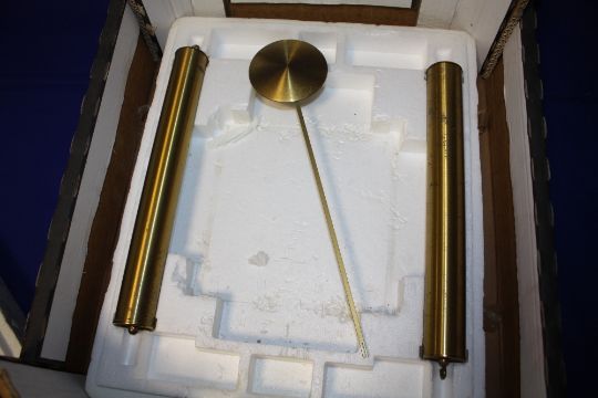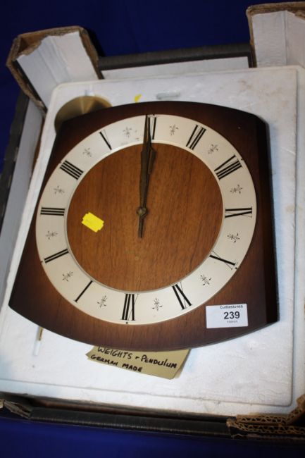 AN OAK WALL HANGING WALL CLOCK WITH PENDULUM AND WEIGHTS
