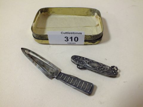 A HALLMARKED SILVER TROWEL SHAPED BOOK MARK TOGETHER WITH A FOLDING CHATELAINE BUTTON HOOK