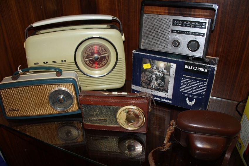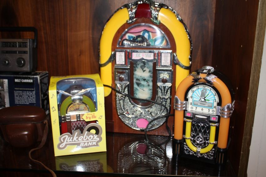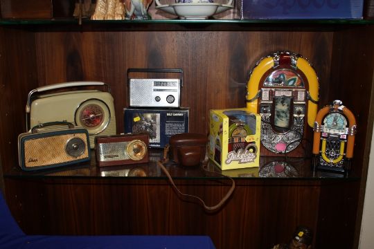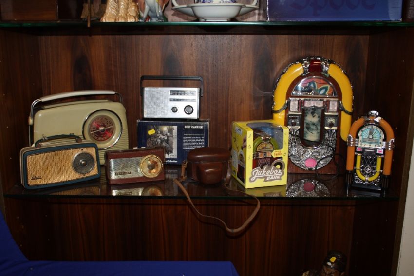 A COLLECTION OF VINTAGE RADIOS, A JUKE BOX RADIO AND MONEY BANKS ETC (9)