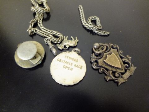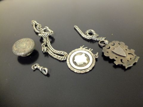 A COLLECTION OF SILVER AND WHITE METAL TO INCLUDE A HALLMARKED SILVER FOB MEDAL