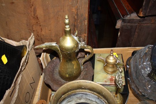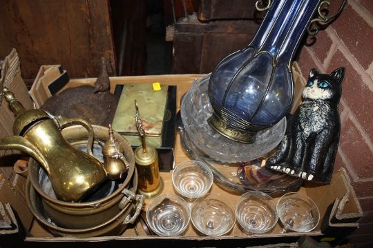 A TRAY OF BRASS AND GLASSWARE ETC TO INCLUDE A CAT SHAPED DOORSTOP ETC