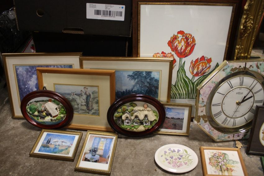 A GILT FRAMED MIRROR TOGETHER WITH A QUANTITY OF PRINTS, WATERCOLOUR, CLOCKS ETC
