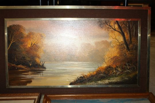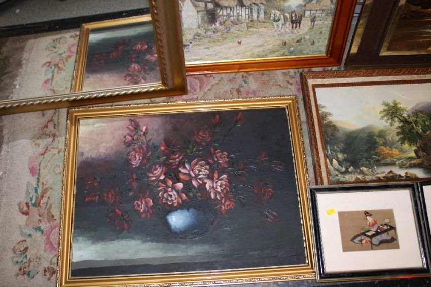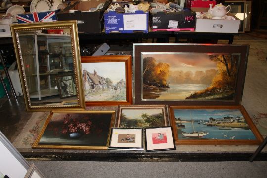 A QUANTITY OF PICTURES AND PRINTS TO INCLUDE A LARGE OIL ON CANVAS OF A RIVER SCENE, OIL ON BOARD, MIRROR ETC