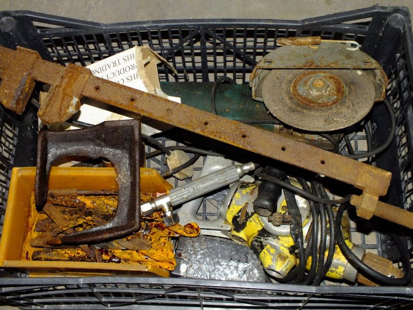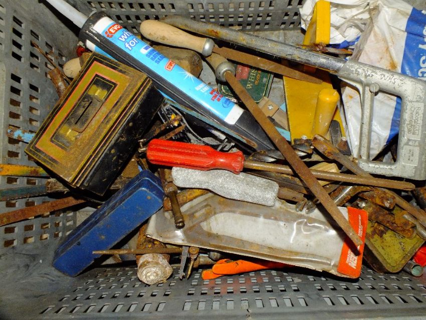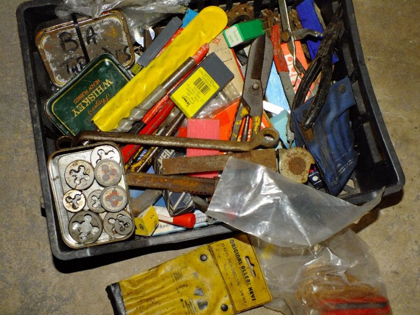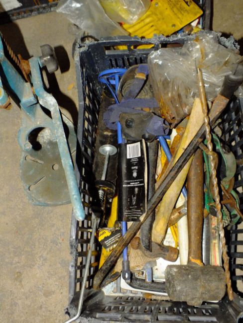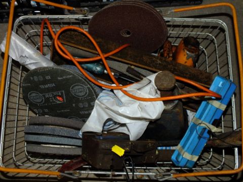 FIVE TRAYS OF MIXED TOOLS AND PARTS TO INCLUDE GRINDING DISCS ETC