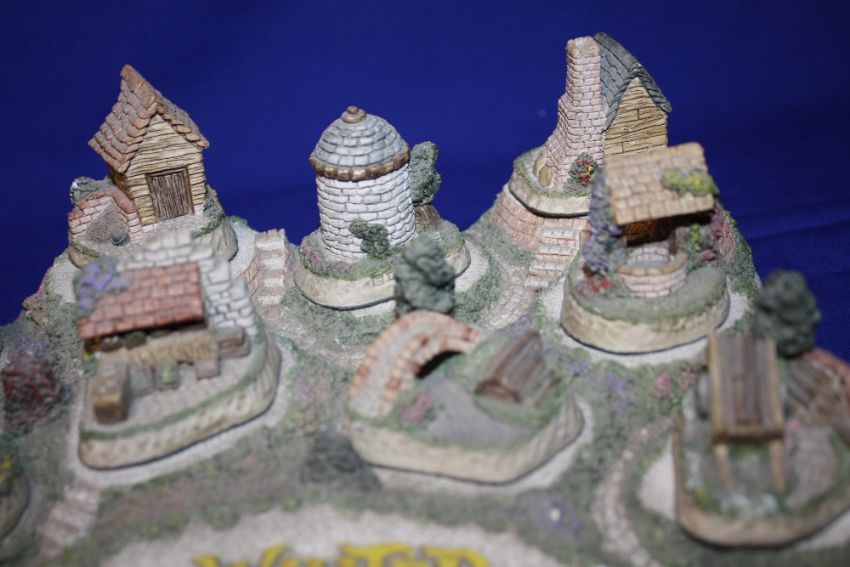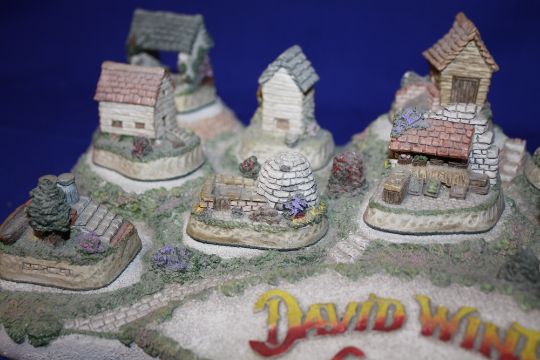 A COLLECTION OF DAVID WINTER CAMEO COTTAGE FIGURES ON DISPLAY STAND