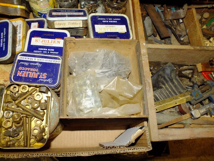 FOUR TRAYS OF MIXED NAILS, SCREWS, HAND TOOLS ETC