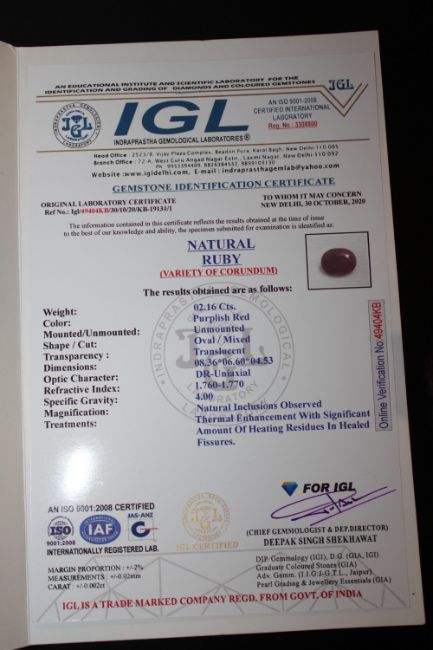 AN IGL CERTIFIED 2.16CT RUBY