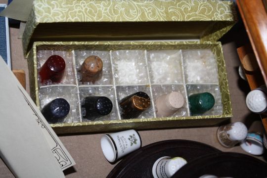 A QUANTITY OF COLLECTABLE THIMBLES TO INCLUDE GEM STONE EXAMPLES, STANDS ETC