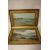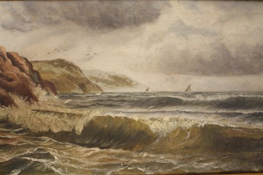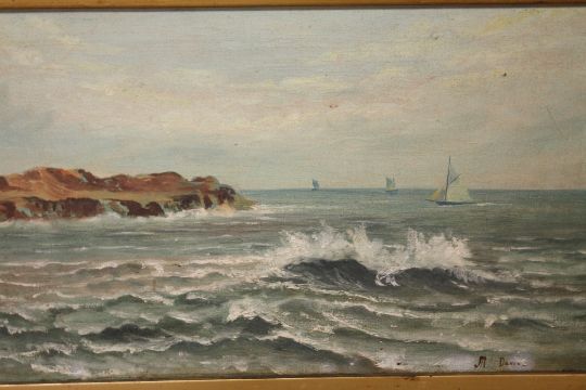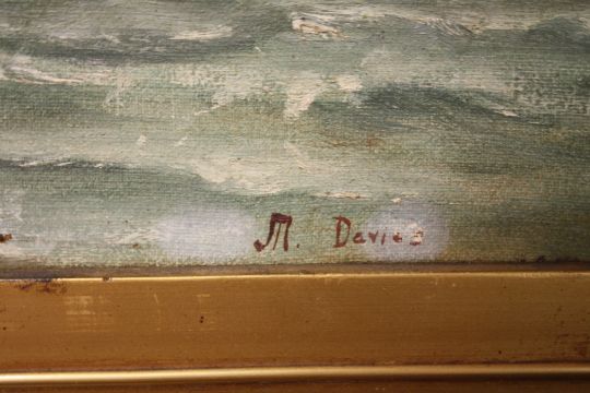 A PAIR OF ANTIQUE GILT FRAMED OIL ON CANVASES DEPICTING SEASCAPES SIGNED M DAVIES SIZE - 44CM X 24CM