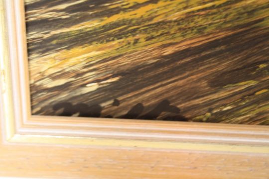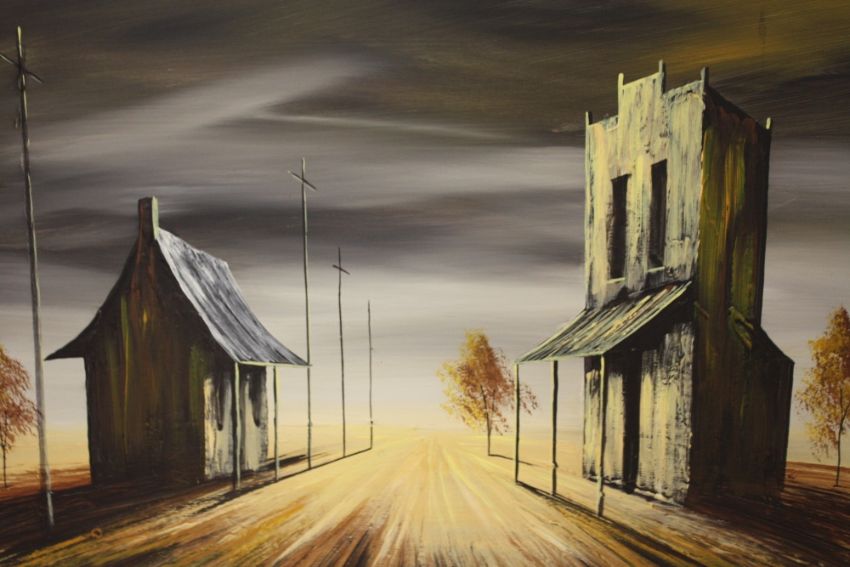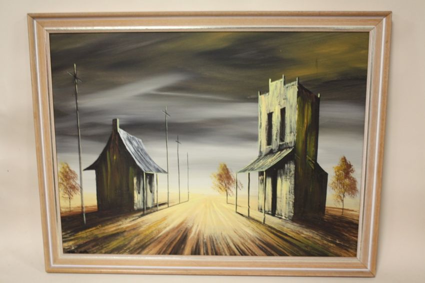 A FRAMED OIL ON BOARD OF A MID WEST AMERICA STYLE ROAD INDISTINCTLY SIGNED LOWER LEFT, 61CM X 45.5CM