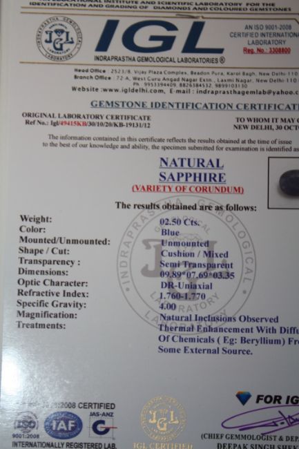 AN IGL CERTIFIED OVAL CUT 2.5CT SAPPHIRE