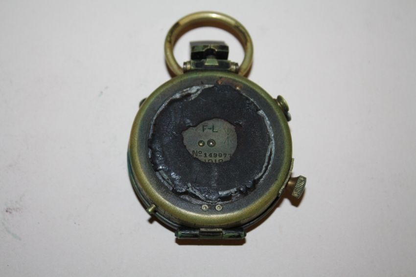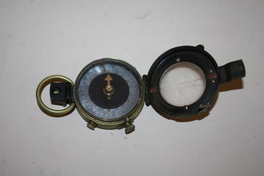 A 1918 MILITARY STYLE BRASS COMPASS IN LEATHER FITTED CASE