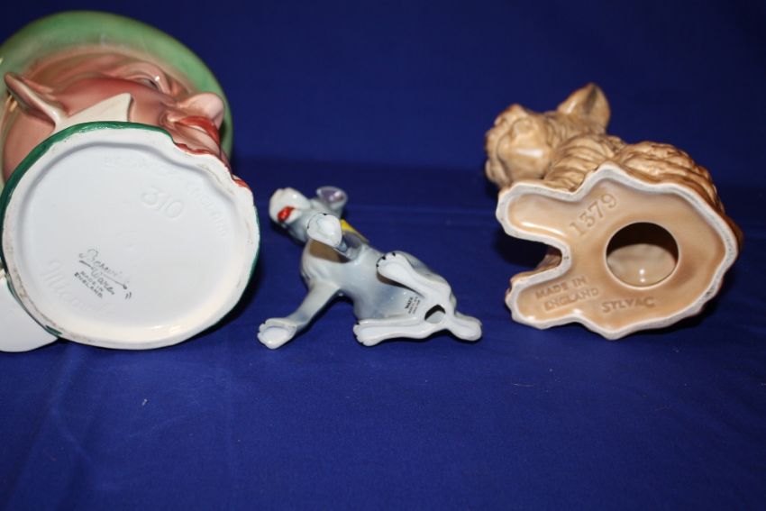 A SYLVAC DOG, A WADE LADY AND THE TRAMP FIGURE AND A MICAWBER CHARACTER JUG (3)