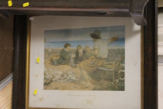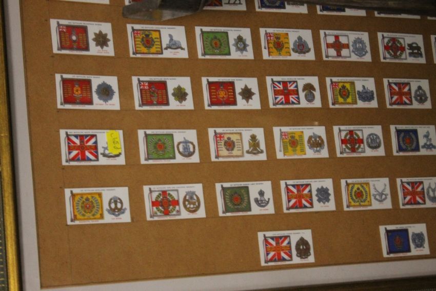 A FRAMED SET OF REGIMENTAL CIGARETTE CARDS TOGETHER WITH A FRAMED AND GLAZED PRINT 'THE BOYHOOD OF RALEIGH' AND AN OAK CASED WALL CLOCK A/F