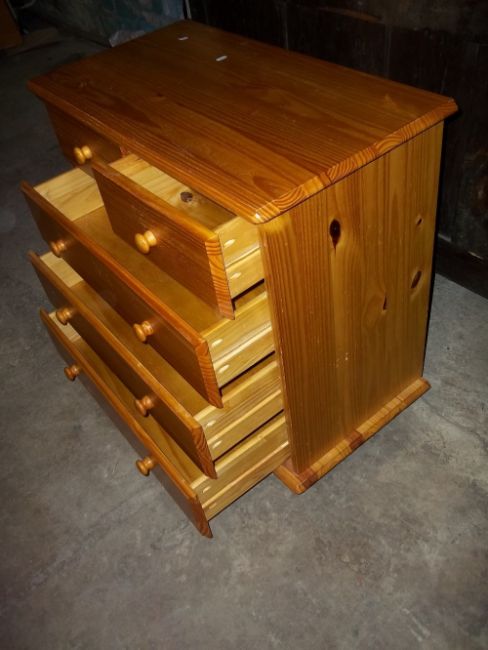 A SOLID PINE THREE DRAW CHEST OF DRAWS, TWO OVER THREE
