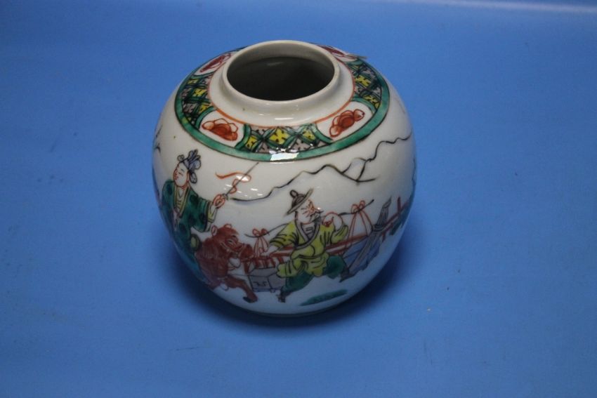 A PAIR OF ORIENTAL VASES TOGETHER WITH AN ORIENTAL LIDDED POT, NO MARKS (3) Condition report:The lidded pot has a hairline crack to the cover and rubbing to the rims.  The two jars have no chips or cracks we can find.