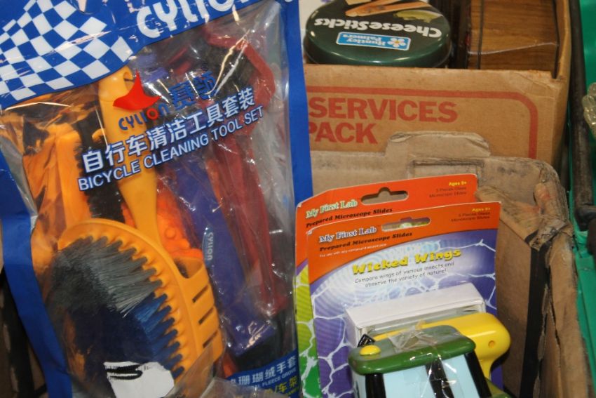 A TRAY OF NEW ITEMS TO INCLUDE A BICYCLE CLEANING KIT, ETC.